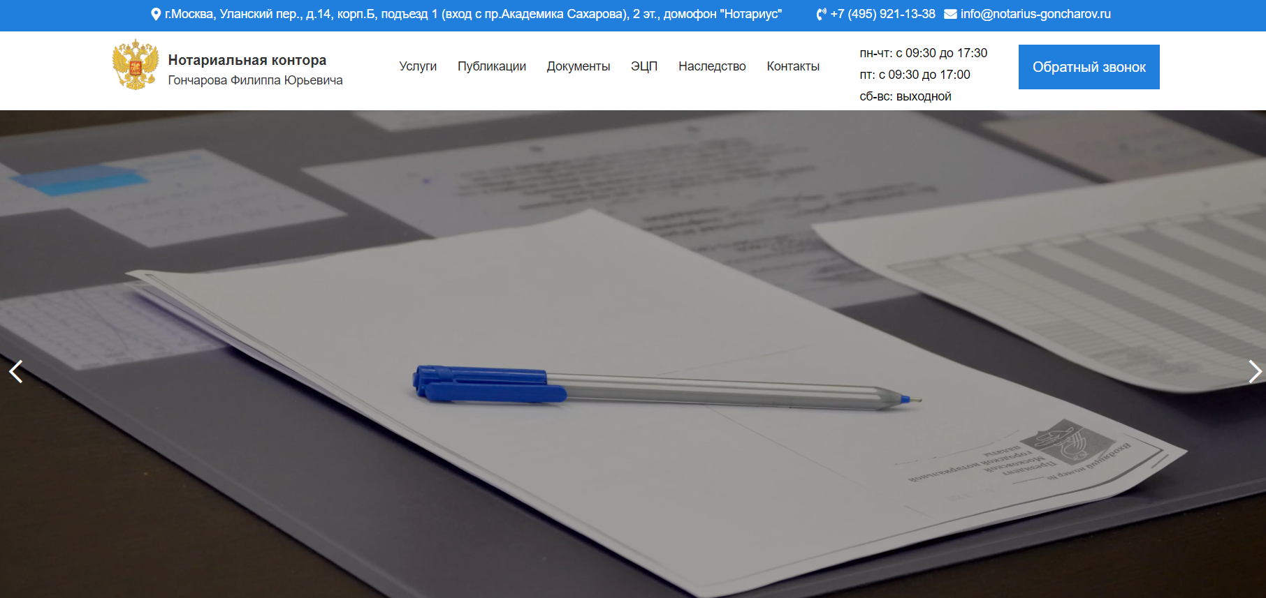 Notary of the city of Moscow Goncharov F.Yu. performs all notarial actions provided for by current legislation, including certifying a power of attorney for vehicles, consent to children traveling abroad, certifying contracts and agreements, including agreements for the sale and purchase of shares in an LLC, certifying protests of bills, provides evidence, testifies to the authenticity of signatures on statements of citizens and legal entities and on bank cards.